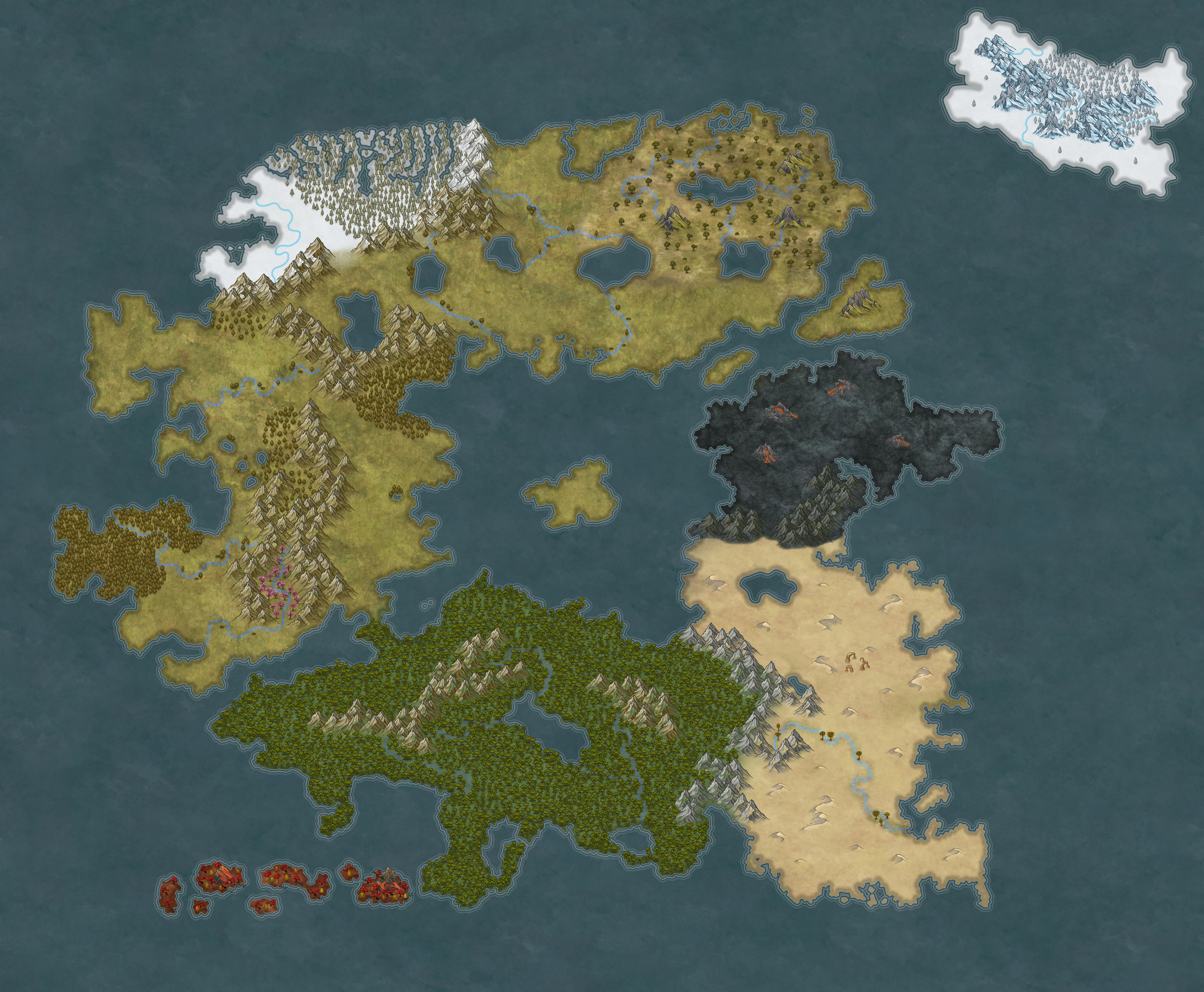 I originally started out making the whole north a frozen tundra, however that started feeling a bit cliched and my previous campaigns have both featured this, so I confined the snowy landscape to the island in the north. After deciding this, I quite liked the idea of some seasonal locations as a concept to tie in with our pantheon (a temple for each deity in a specific location that matches them, for example?) so I made the islands to the south autumnal themed.